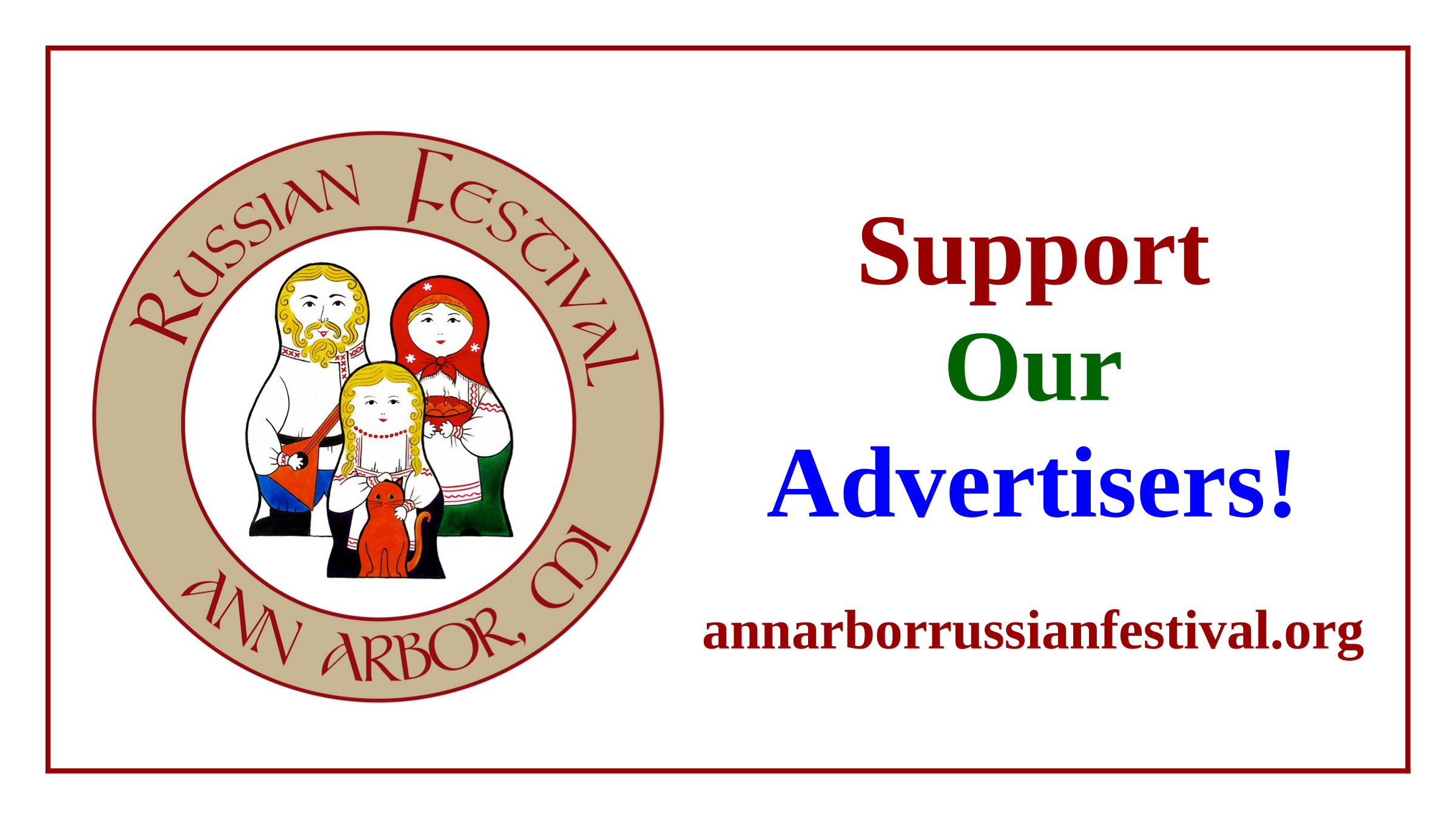 If you are interested in becoming our sponsor please contact Snezhana Knysh - Russian Festival 2024 Sponsorship Committee Chair: (734) 276-0107 or annarborrussianfestival@gmail.com